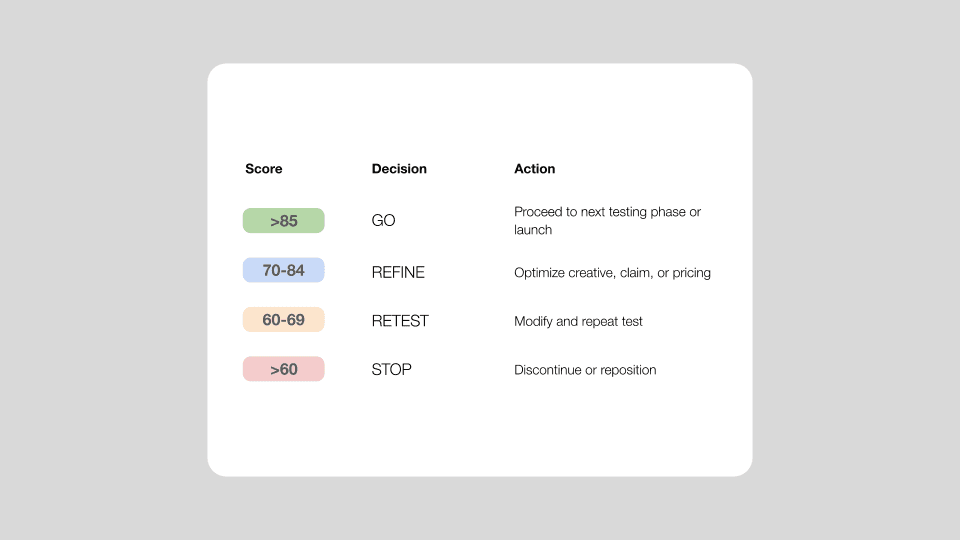 We apply a structured, three-phase testing model that blends AI simulations, consumer interviews, and real-world behavioral data into a unified Launch Readiness Score — a single, objective indicator of whether an idea is ready to launch and scale.