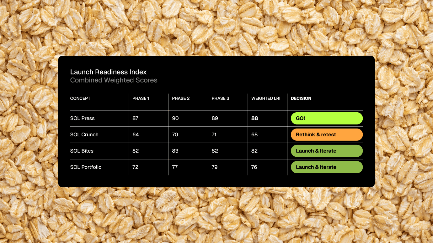 The Launch Readiness index is our scoring system that measures the impact of each phase of the process, providing each concept test with a weighted combined score between 0–100. This score provides a clear, data-backed business case on the potential of the concept if it were to launch.