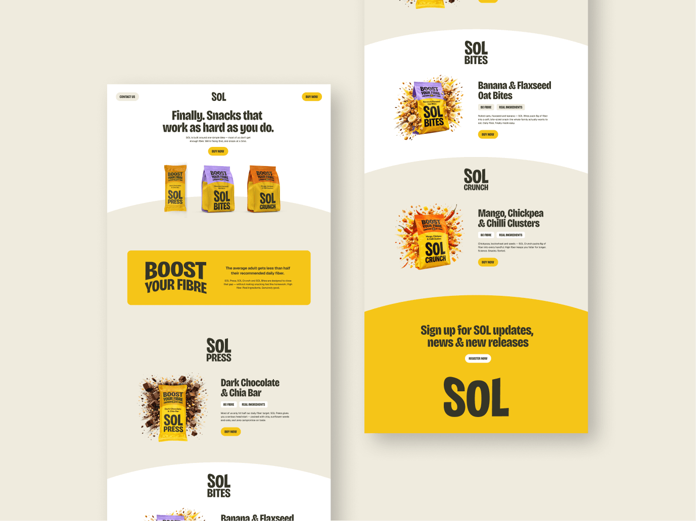The SOL landing page featured each product in it's own section with a dedicated 'Buy Now' button for each. This enabled us to measure purchase intent by product. When clicked the user sees a pop-up box that states we're launching soon and requests they sign up to receive launch offers and promotions.