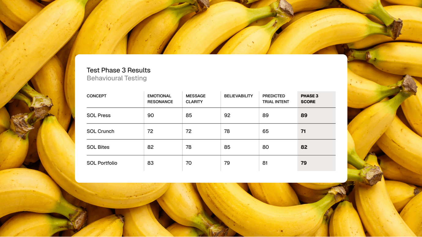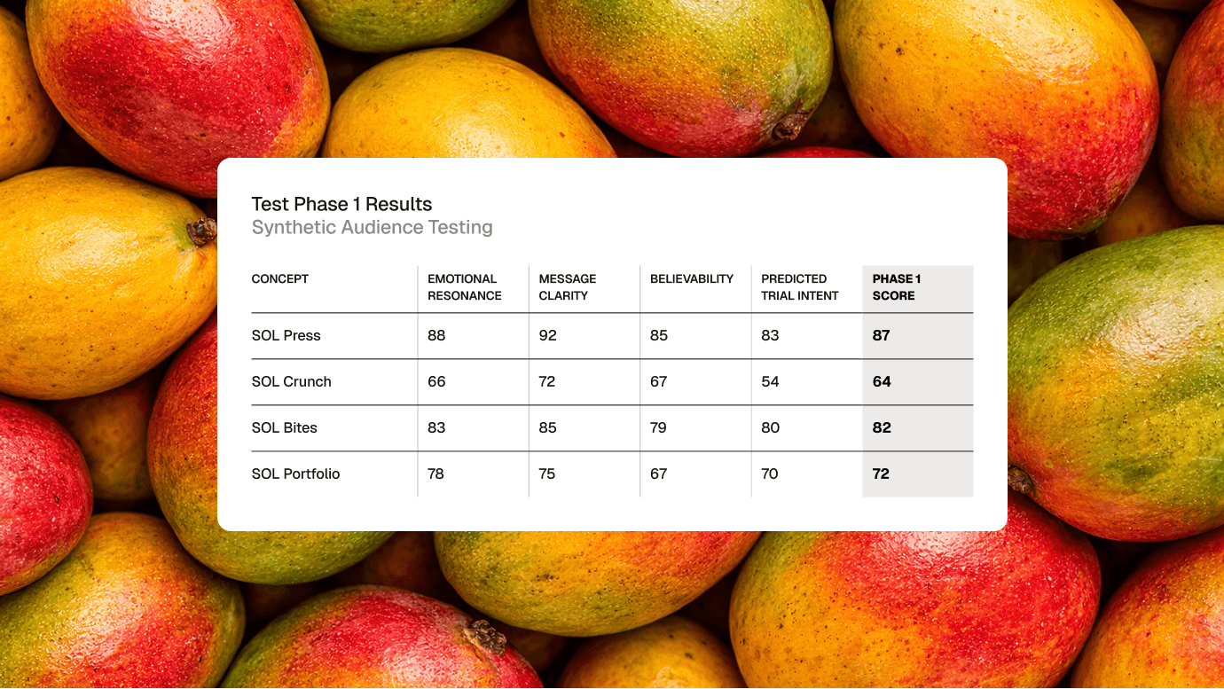We created an artificial society grounded in our primary audience demographic: Health-aware, time-poor urban professionals aged 25–40 who want to make better food choices but need snacking to do the work for them. Using this artificial society of 250 people we tested our brand, product and value proposition messaging. At this stage we test multiple copy executions for each value proposition to identify which are strongest.