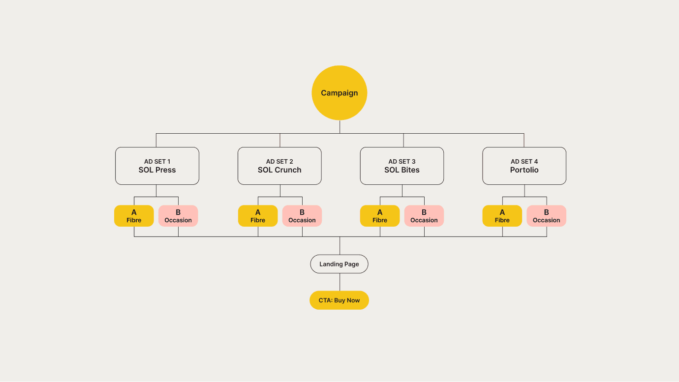 We created a small portfolio of three products to test the hypothesis. In addition to A/B testing each product we will test a Portfolio ad set to capture data around individual product performance vs portfolio performance. The landing page features a ‘Buy Now’ CTA which leads to a ‘Sign up for launch’ form. Whilst not our primary objective for this test, it will provide insight into purchase intent.