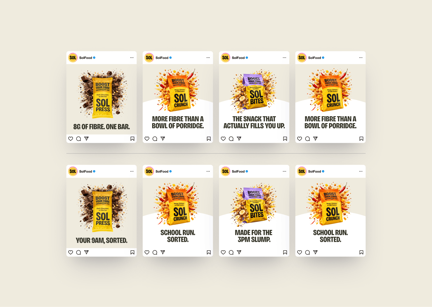 There are strong signals that the fibre deficit product benefit has potential to build a range of snacks around. SOL Press is the lead product. SOL Crunch’s flavour is misunderstood and doesn’t meet the occasion. Launch the Press and Bites targeting a post-gym audience for both lunch and snack occasions in an office setting. Gain traction with this core then expand with a sweet variation of Crunch. Continue to refine as other market signals emerge.
